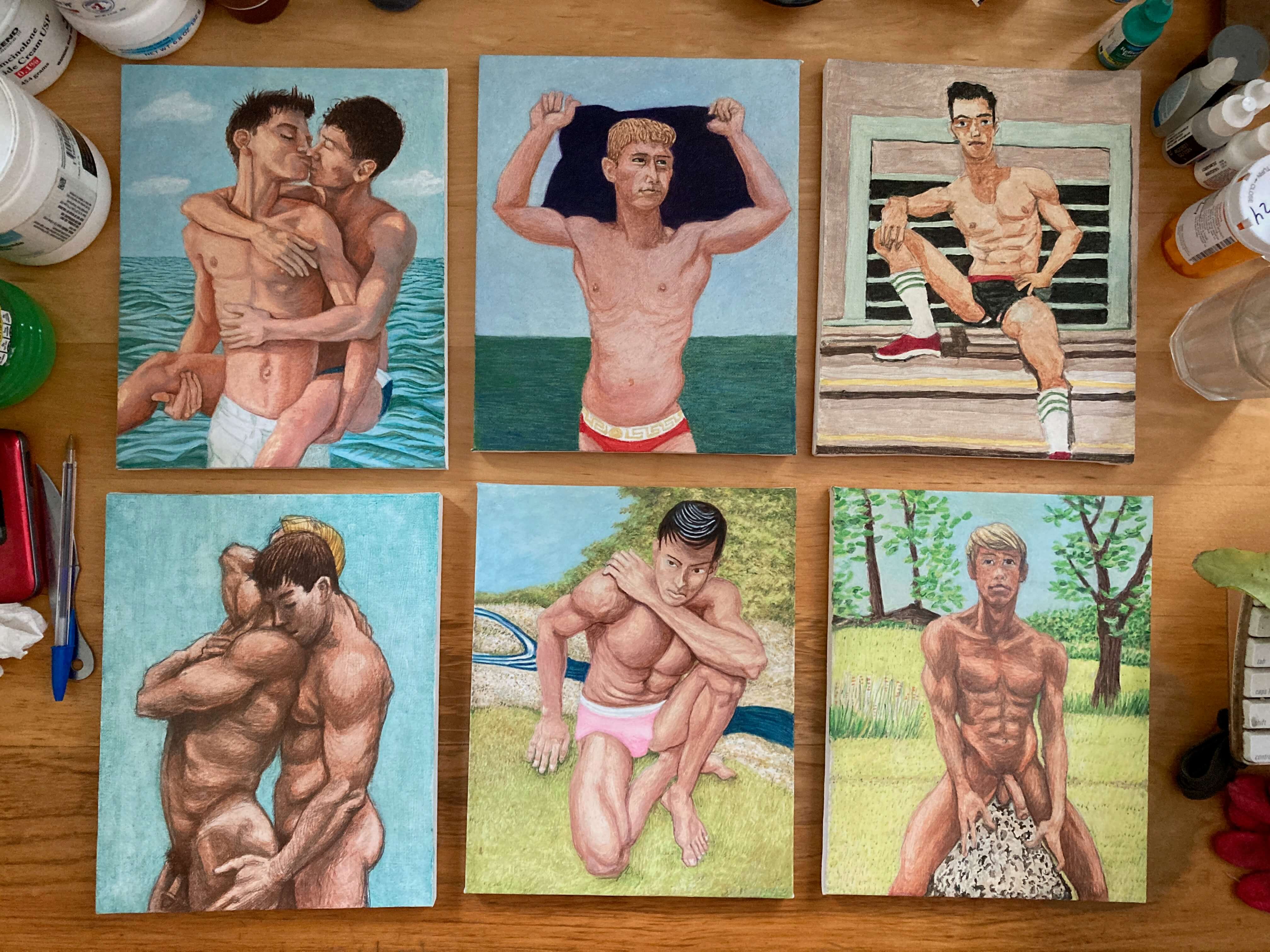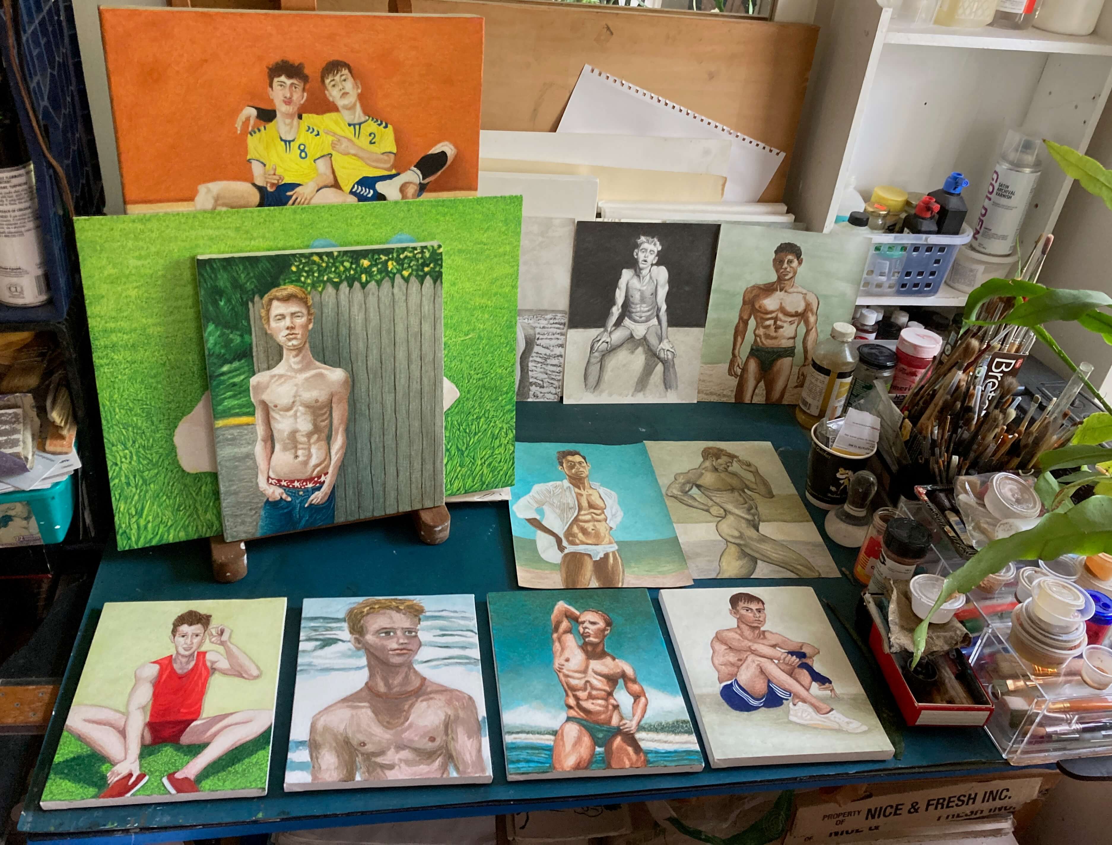 Recently I gathered small paintings that I mostly painted this year and brought them outside to give a first coat of spray varnish.